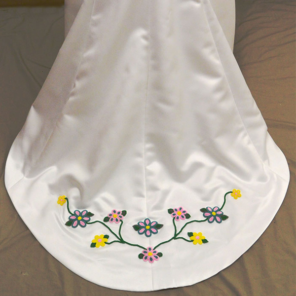 A-line style dress with princess seams, scoop neckline, and sweep train. Polyester satin. Multi-coloured beadwork on front and back bodice, and bottom of train.